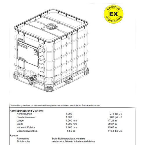 IBC-Container ECOBULK EX leitfähig Inhalt: 1000 Liter (275 gal) - Zugelassen für den Einsatz in explosionsgefährdeten Zonen 1 und 2, unter Beachtung der gesetzlichen und unternehmensspezifischen Sicherheitsmaßnahmen und Vorschriften - Vermeidung von gefährlicher Aufladung des Behälters durch Aussenschicht aus leitfähigem, schwarzen PE-HD - Erdungsanschluss bauseits - Zusätzlicher UV- und Lichtschutz des Füllgutes - Geeignet für Füllgüter mit einem niedrigen Flammpunkt = 60°C - Ableitung elekrostatischer Aufladung des Füllgutes über geerdete Auslaufarmatur S60x6 als integriertem Klappenhahn DN 50 - Elektrostatisch sicher gemäß IEC/TS 60079-32-1 von 2013 und TGRS 727 von 2016 - Abmessungen: L x B x H = 1200 x 1000 x 1160 mm - Maximale Dichte: 1,6 g/cm3 - Mit robuster Stahl- / Kunststoff-Kombipalette und verzinkten Stahlrahmen, unterfahrbar mit Hubwagen - Aussen mit verschweißtem Stahlrohr-Gitter, verzinkt - Einfüllöffnung DN 150 mit D17 Entgasungsmembran im Deckel - Lebensmittelzulassung: Nein - CDS1-System: Nein - UN-Y-Gefahrgutzulassung: Ja |