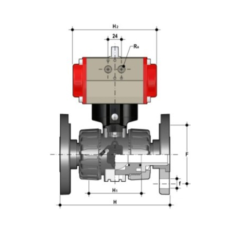 | 2/2-Wege-Kugelhahn mit gesicherten Überwurfmuttern aus PVC-U mit pneumatischem Stellantrieb Funktion: normal geschlossen Steuerdruck: Standard 5 bar reduzierter Steuerdruck: auf Anfrage Steueranschluss: G 1/4' Namur ***DN65-100 PN16 auf Anfrage Anschluss: Festflansch aus PVC-U, gebohrt mit ovalen Schraubenlöchern für DIN und ANSI Standards Dichtung: PTFE/FPM |