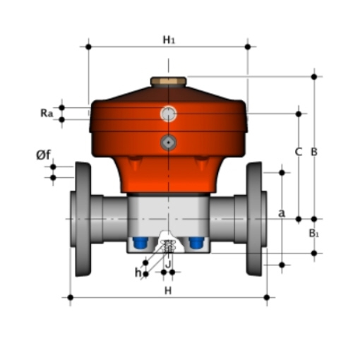 | 2/2-Wege-Membranventil mit pneumatischem Stellantrieb Gehäusewerkstoff: PVDF Funktion: dppelt wirkend (DA) Membranwerkstoff: PTFE/EPDM Steuerdruck: max. 6 bar Steueranschluss: R 1/4' Betriebsdruck: einseitig anstehend Anschluss: PP Festflansch, ANSI Flansche auf Anfrage |