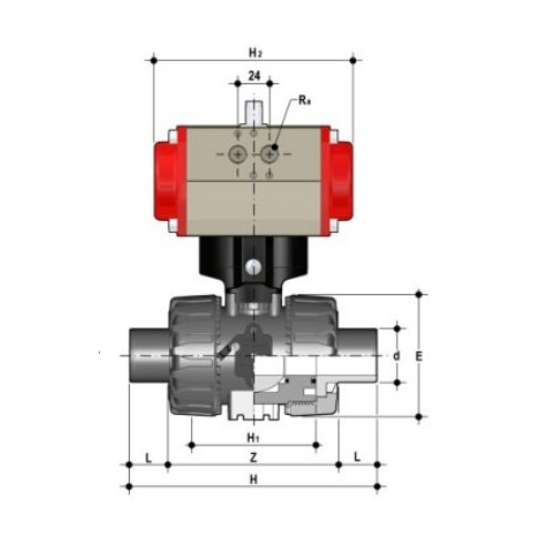 2/2-Wege-Kugelhahn mit gesicherten Überwurfmuttern aus PVDF mit pneumatischem Stellantrieb