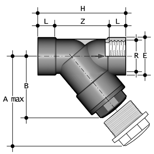 | -Dichtung: FPM -Anschluss: Gewindemuffe -nur für Kunststoffgewinde -eingebautes Filternetz mit Maschenabstand 1,5 mm, Verunreinigung ab 0,5 mm trennbar -Einbau: waagrecht und senkrecht in Leitung -Durchflussrichtung: Siebteil nach unten gerichtet -andere Maschenabstände auf Anfrage |