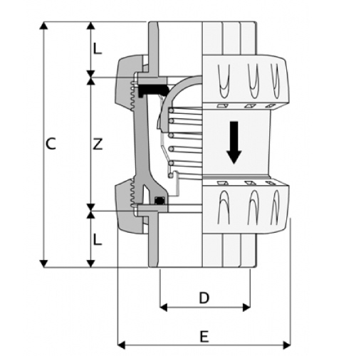 | -Anschluss: beidseitig Klebemuffe -Dichtung: EPDM -Dichtkolben: PVC-U -Feder aus AISI 316 (V4A) -Durchfluss nur in eine Richtung möglich -Einsatzbereich: Flüssigkeiten mit Dichte kleiner 1,37 g/cm³ -geeignet für senkrechten und waagrechten Einbau Ausführung in FPM bitte anfragen. |