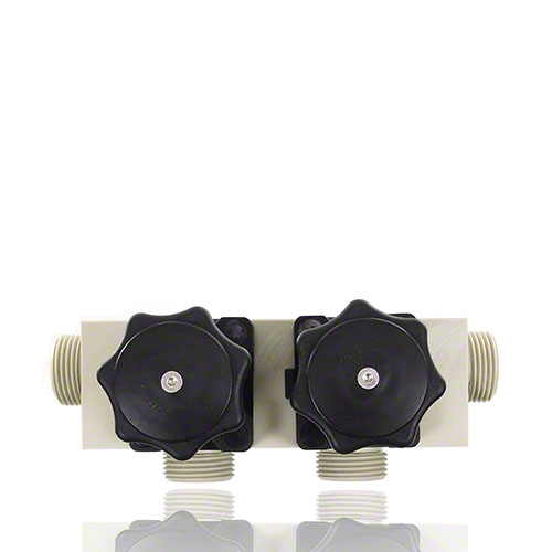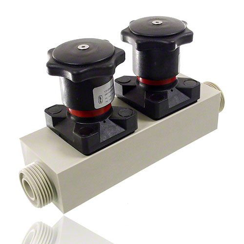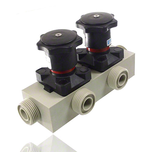 Mehrwegeventil aus PP mit zwei Handantrieben, Abgang reduziert, Membrane EPDM